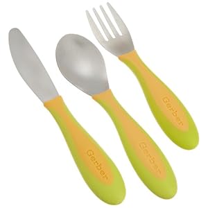 Since we did baby-led weaning, Carys has been using forks and spoons for quite a while. We graduated her to metal ones recently, and she uses them pretty expertly. Since we don't need/use the knives yet and had plenty of spoons, we actually bought the pack that had just forks in it. They're high quality, easy to grip, and not sharp, though they are pointy enough that she can use them to stab just about any food. A great transitional piece from plastic spoons to real flatware! We actually take one with us (alone with a sleeved bib and a disposable table protector) whenever we go out to eat.