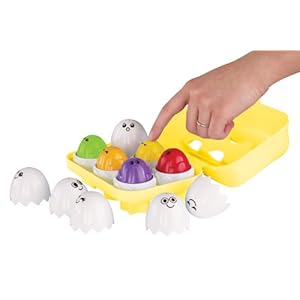 I got this darn thing on a whim from WALGREENS, of all the silly places. I'm sure our version is made in China and covered in lead paint, but she loves it. She loves dumping it out, fitting the caps back on the eggs, taking them all out and putting other things in the egg carton, making them squeak...this is a toy that I wish we would have had when she was much younger, as I think it would have been just as entertaining to her as a baby. The whole egg comes out, and then the top of the egg comes off (so it's a total of 13 pieces - two pieces for each of the six eggs and the case). The bottom of each egg has a different shape on it that corresponds to a shape in the bottom of the egg carton, so she can't perfectly put the eggs back in yet, as she doesn't know her shapes. I think it could be used for matching, color recognition, and shape recognition as well eventually. But for well under $10, it's a definite win. Unless you step on it. Then you may curse.